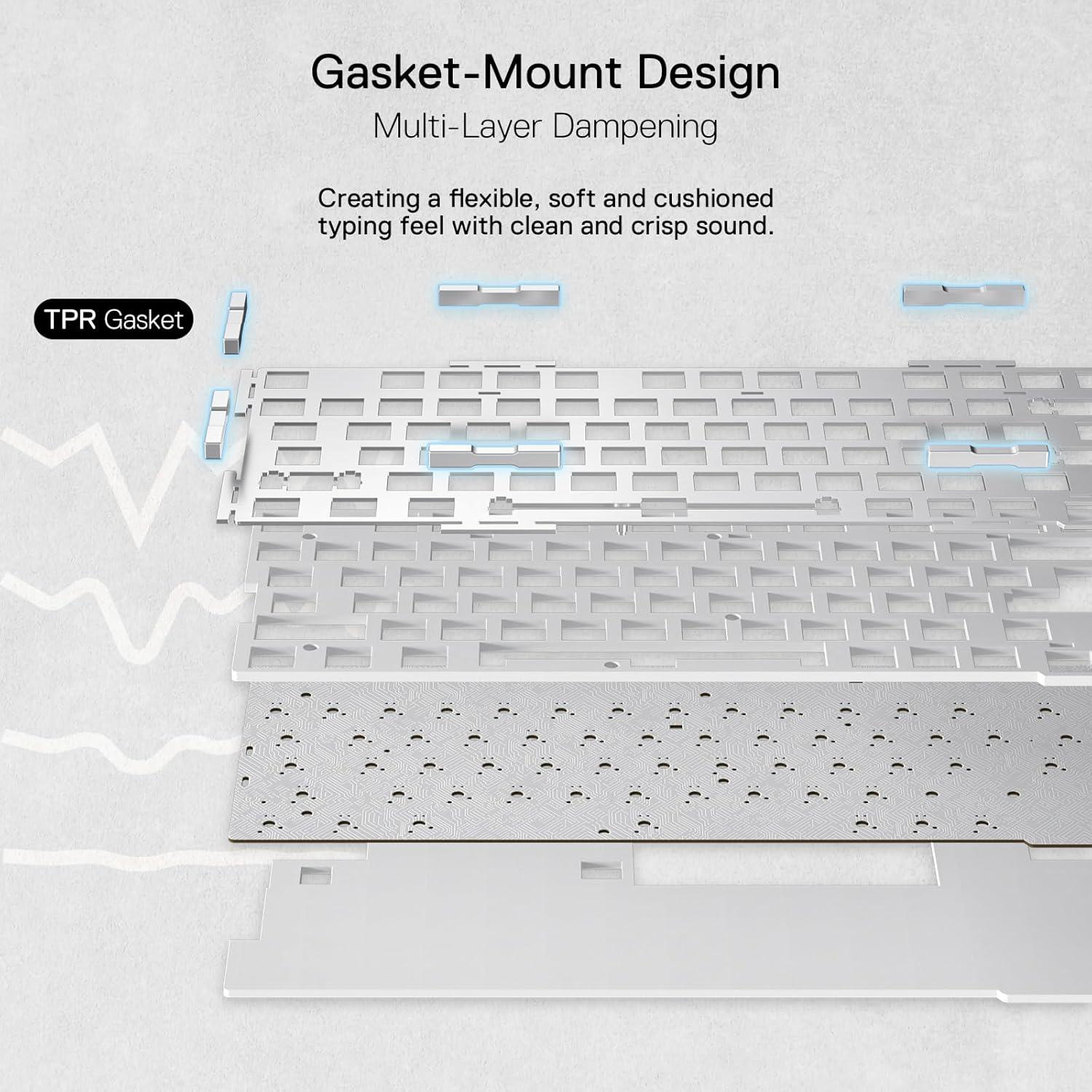 Noise Dampening x 5 – Equipped with 3.5mm PO foam, IXPE switch foam, PET sound pad, bottom socket foam, silicone bottom pad along with the silicone gasket. Significantly reduce the hollow noise, creating dampened and ultra-clean typing acoustics, making each keystroke satisfying and comfortable.