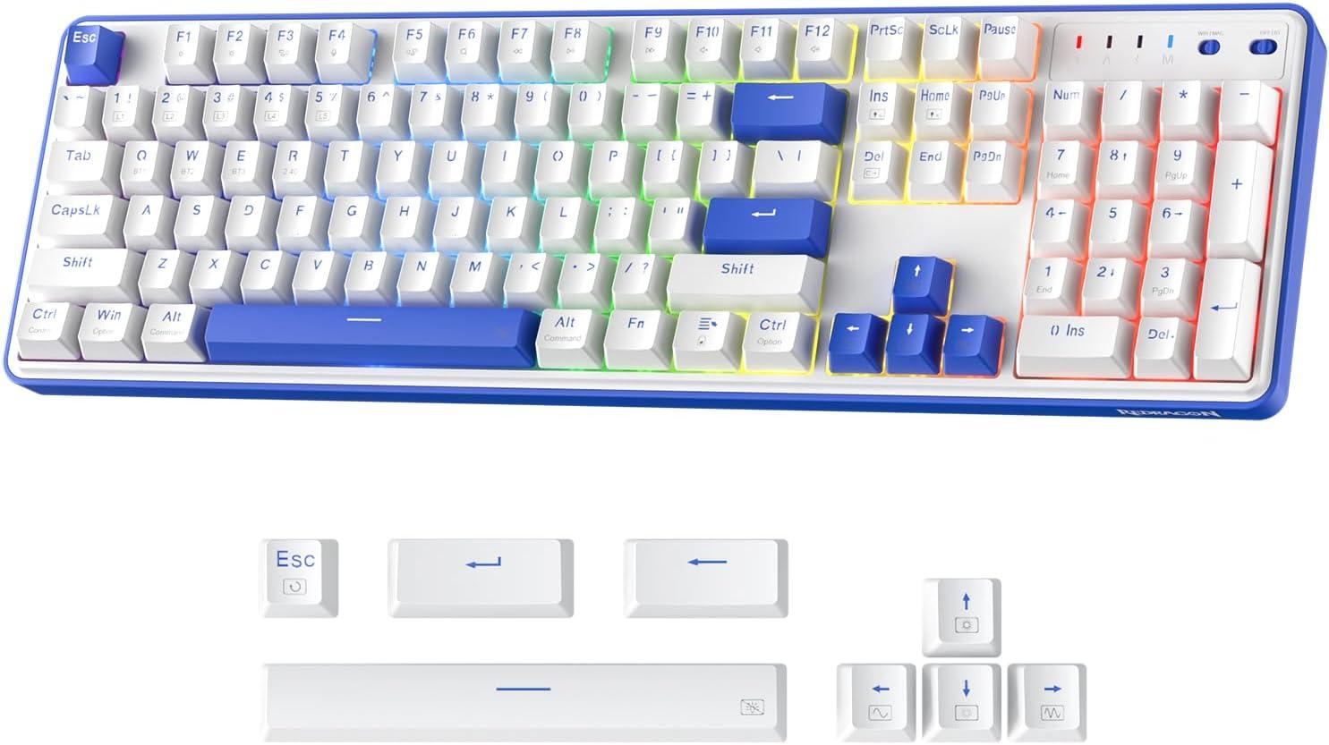 Mixed Blue & White Keycaps – Designed with white main color keycaps and 8 blue keycaps decored, delivering a fresh, vibrant and stunning eye-catching look. Come along with an extra 8 decor keycaps pack in white color.