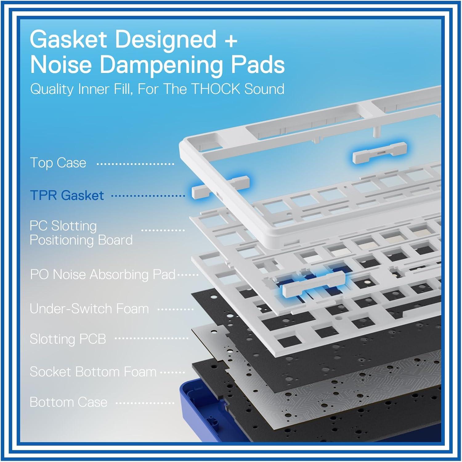 GASKET Design – The body structure differs from traditional screw fixing by using precision-locked covers with gaskets to assist with noise reduction and flexibility. It provides even feedback while the vertical cushioning reduces rigid noise, delivering a crisp, clean and softer typing feel.