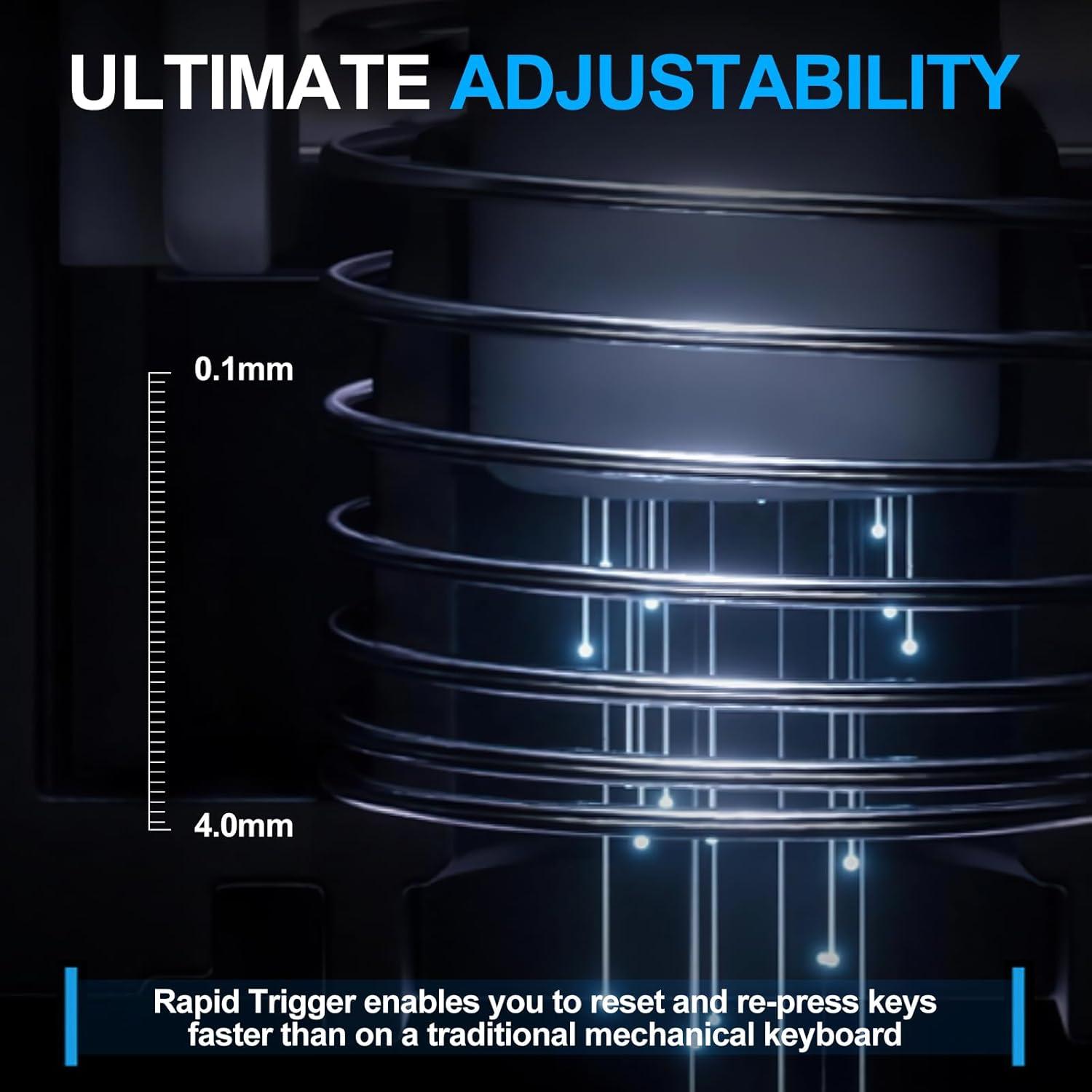 Adjustable Magnetic-Mechanical Switches: The entire keyboard is equipped with fully adjustable Redragon switches, enabling you to set every key's actuation point from a light 0.1mm to a strong 4mm in 0.1mm steps, putting you in control for fast keypresses or ultra-accurate typing.