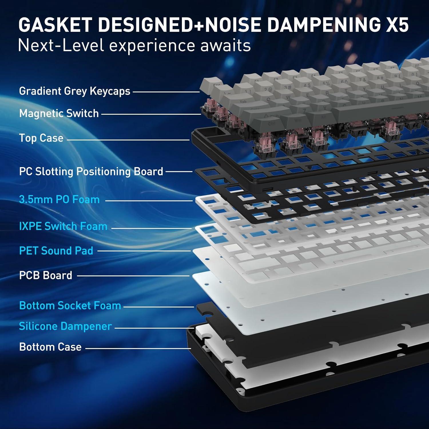 Noise Dampening x 5 – Equipped with 3.5mm PO foam, IXPE switch foam, PET sound pad, bottom socket foam, silicone bottom pad along with the silicone gasket. Significantly reduce the hollow noise, creating dampened and ultra-clean typing acoustics, making each keystroke satisfying and comfortable
