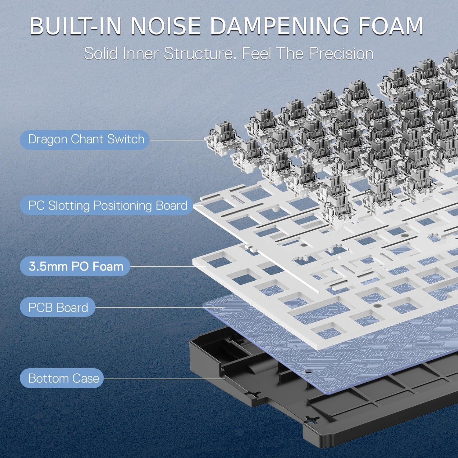 Noise Dampening x 5 – Equipped with 3.5mm PO foam, IXPE switch foam, PET sound pad, bottom socket foam, silicone bottom pad along with the silicone gasket. Significantly reduce the hollow noise, creating dampened and ultra-clean typing acoustics, making each keystroke satisfying and comfortable.