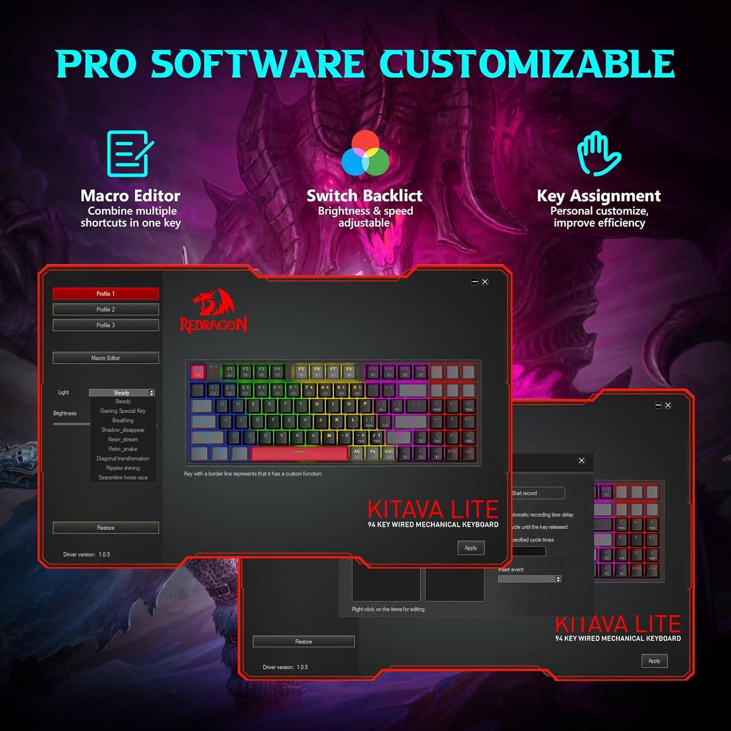 Fully Programmable & Highly Configurable- Expand your options to design your own keys, light effects and macro, the macros with different keybindings or shortcuts combine multiple keys function in one key for more efficient work and gaming.