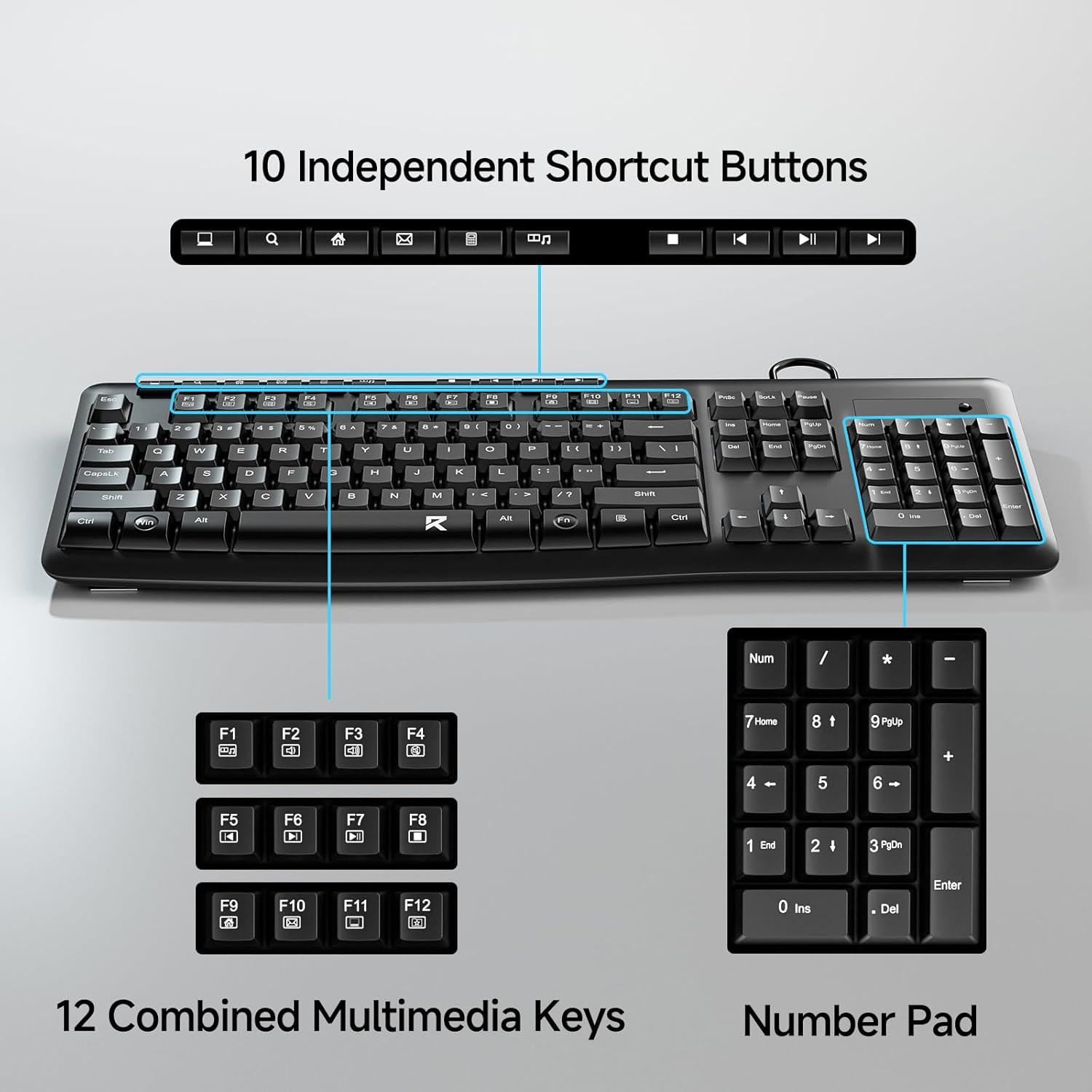 【Multi-functional USB Keyboard】Multi-media USB PC keyboard features a numeric keypad, 10 individual shortcut buttons, and 12 combined multimedia keys (including video, volume, internet, email, etc.) to enhance your workflow and simplify the way you use your computer.